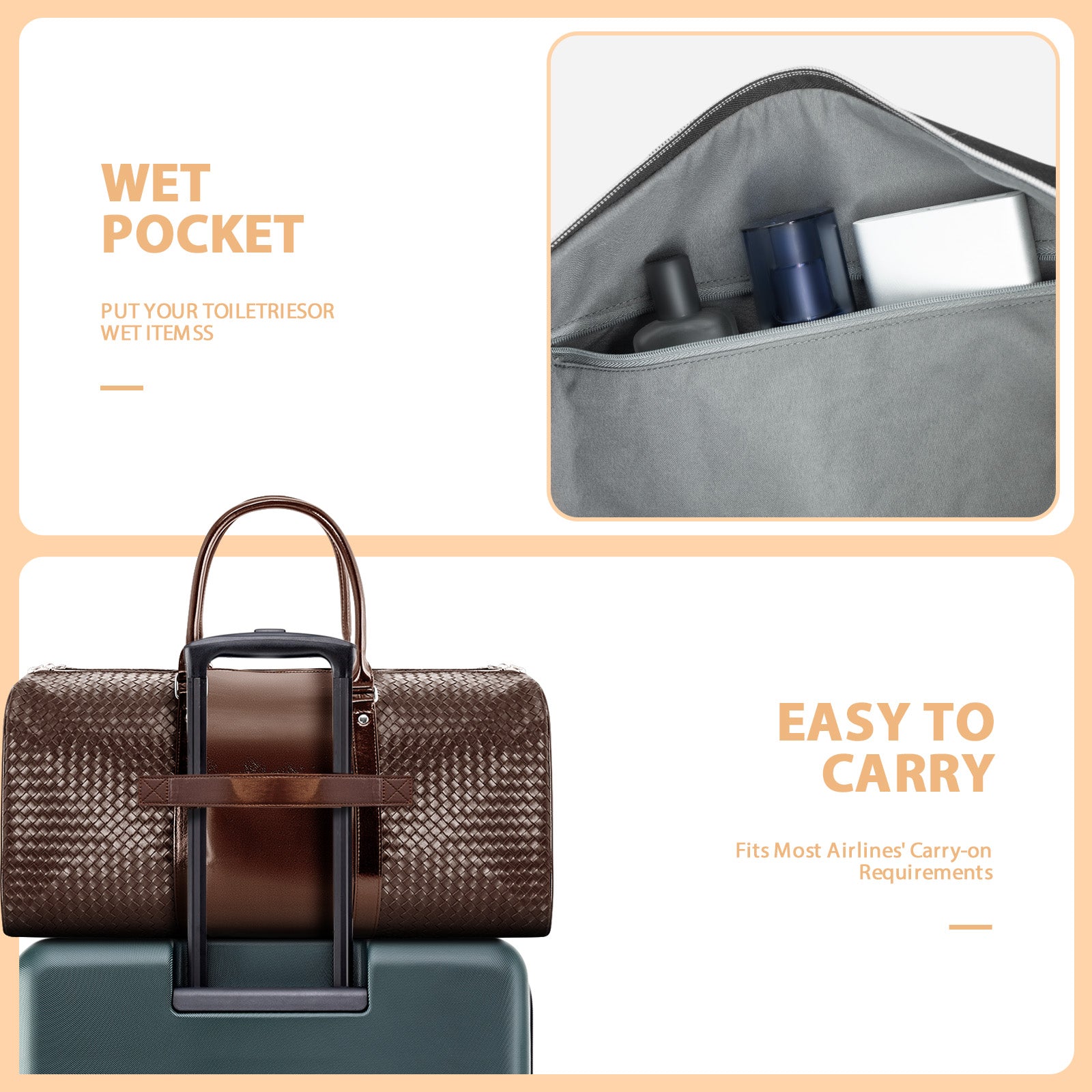 Better Practicality: The leather travel duffel bag has cushioned adjustable shoulder straps. There is a zipper pocket on the front and a luggage bar slot on the back, which makes it easy to attach the travel bag to the luggage bar with more ease